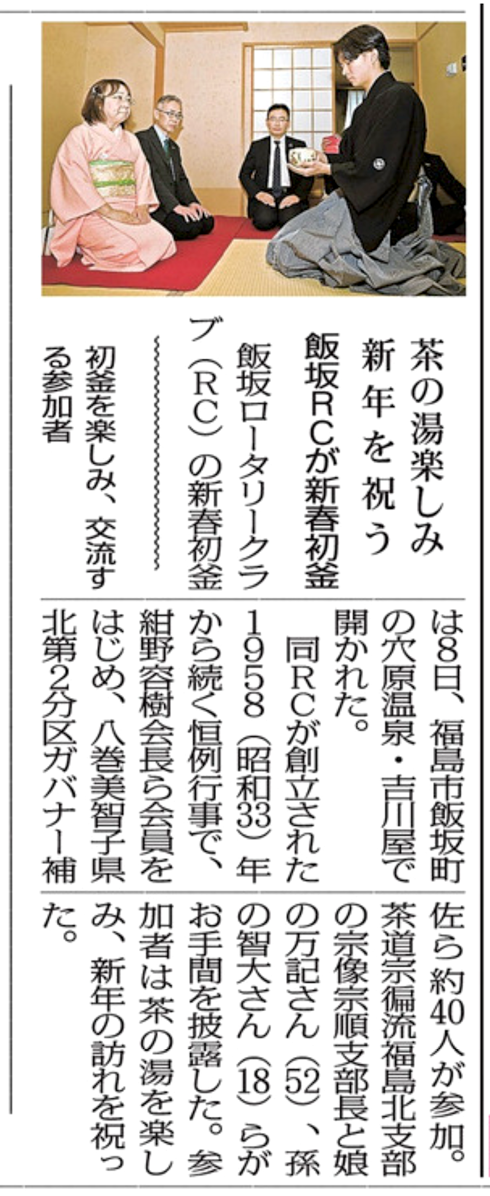 2026-01-13(火) 新年初例会の恒例行事として飯坂ロータリークラブ創立以来続く伝統の新春初釜が、今年も1月8日(木)に吉川屋 特別室の茶室にて家族同伴にて開催されました。宗徧流福島北支部の宗像宗順先生らのおもてなしで、八巻 美智子 県北第二分区ガバナー補佐、石井智幸 梁川RC会長はじめ会員のご家族もお迎えし、日本の伝統文化である茶の湯を楽しみ新年を祝いました。 1/12付 福島民報 福島・県北版 掲載 1/10付 福島民友 福島市内・県北版 掲載